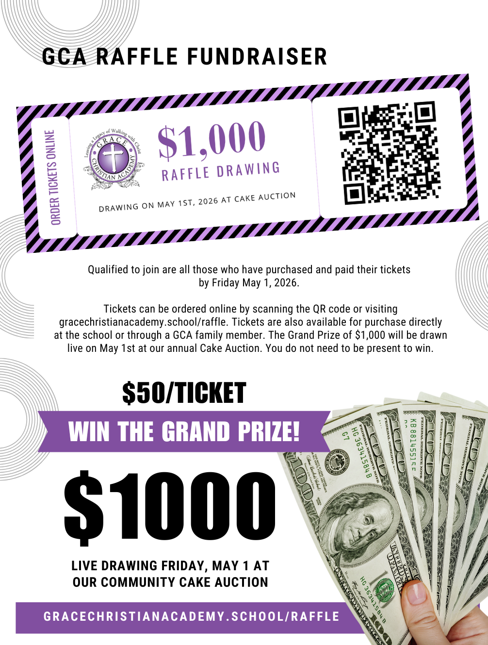 Support Grace Christian Academy and enter for a chance to win $1,000! 🎉 The Grand Prize Winner will be drawn LIVE on May 1st at our annual Cake Auction—but you do not need to be present to win!